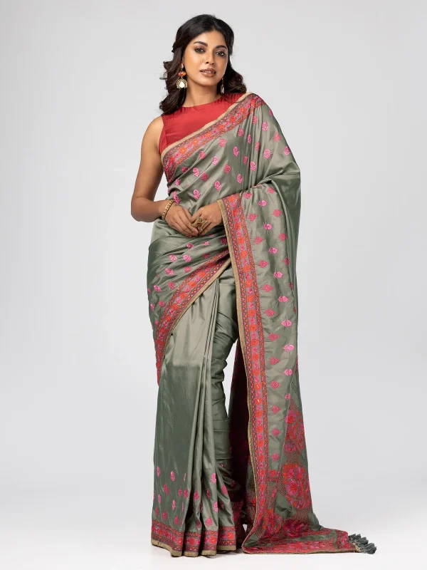 Sage Grey Printed and Nakshi Kantha Embroidered Silk Saree