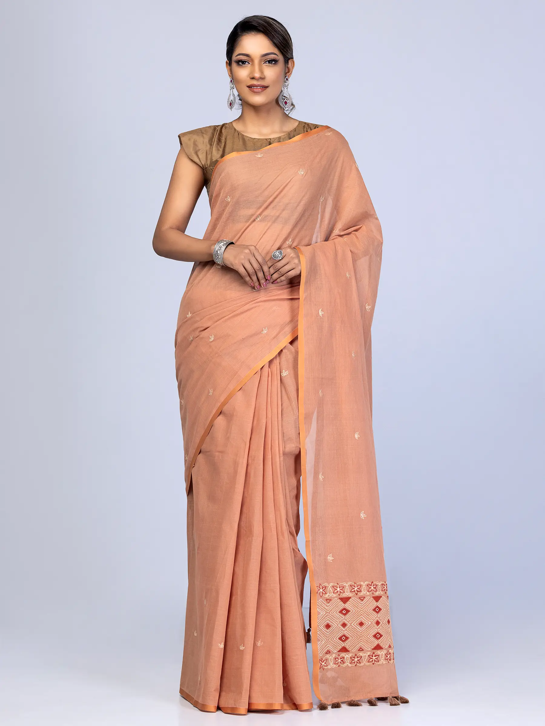 Brown cotton saree with embroidery over appliqued. Comes with matching unstitched blouse piece attached at the end of saree. Blouse shown in the photo is a styling suggestion, it is not a part of the actual product.