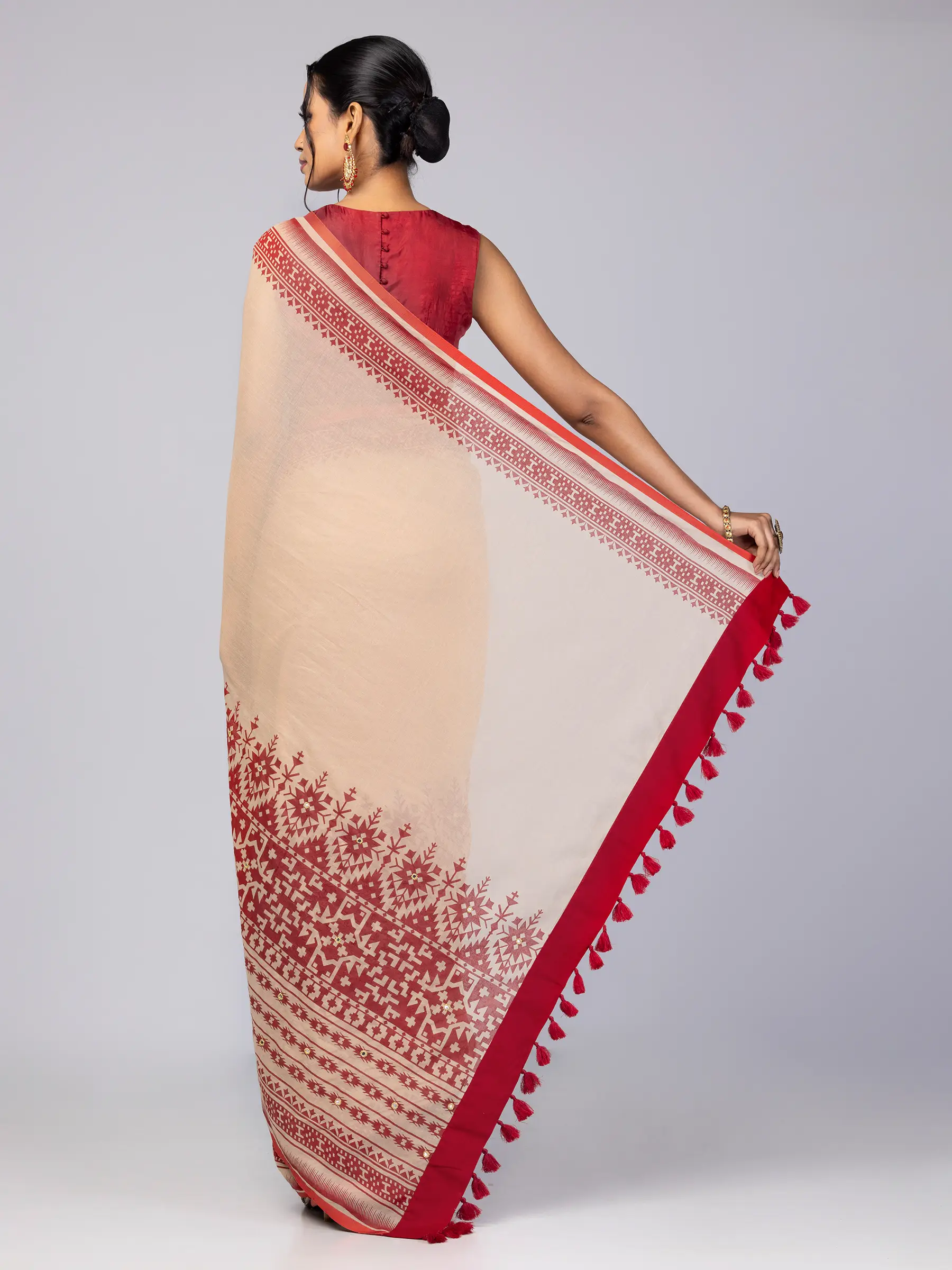 Brown cotton saree with red prints. Comes with matching unstitched blouse piece attached at the end of saree. Blouse shown in the photo is a styling suggestion, it is not a part of the actual product.