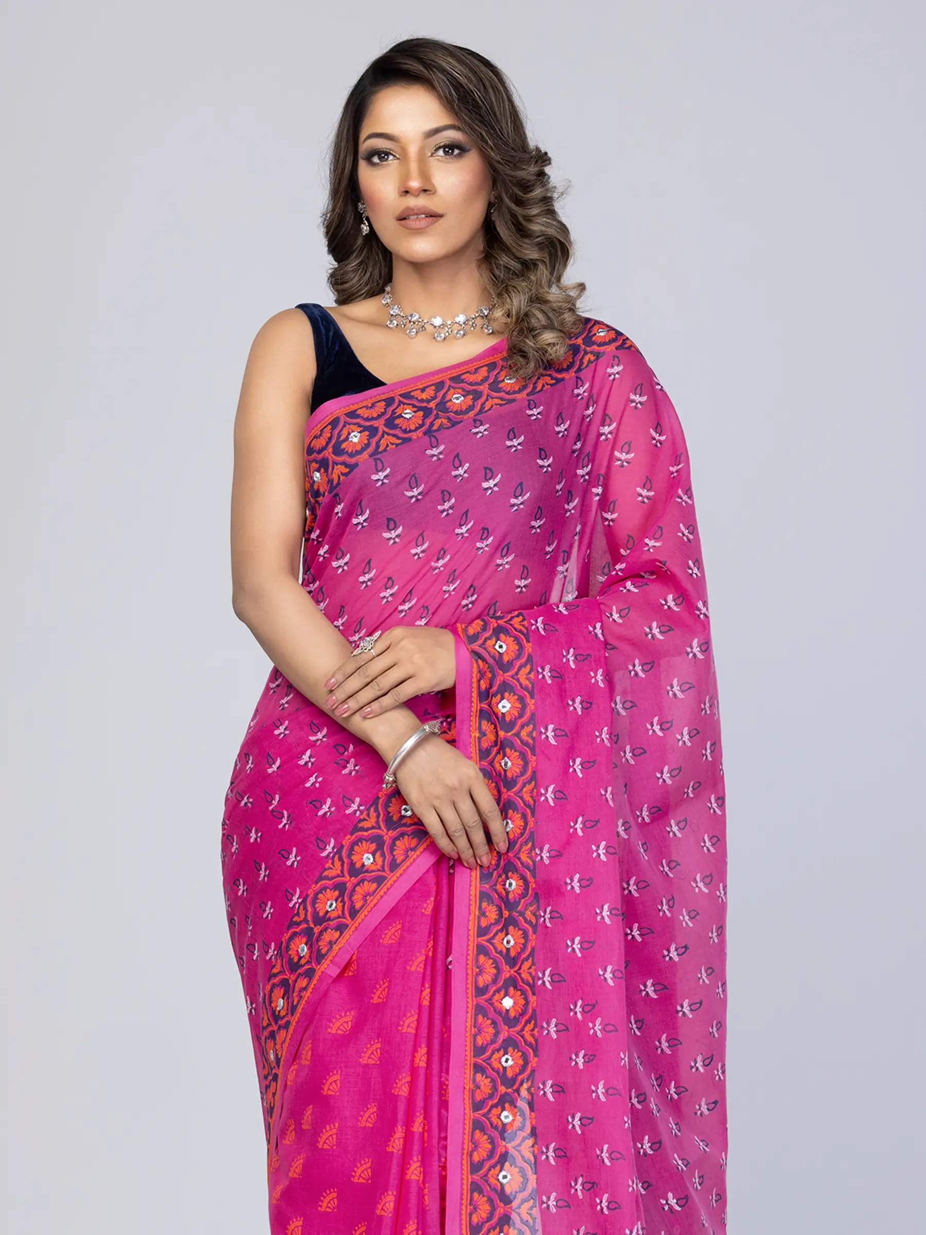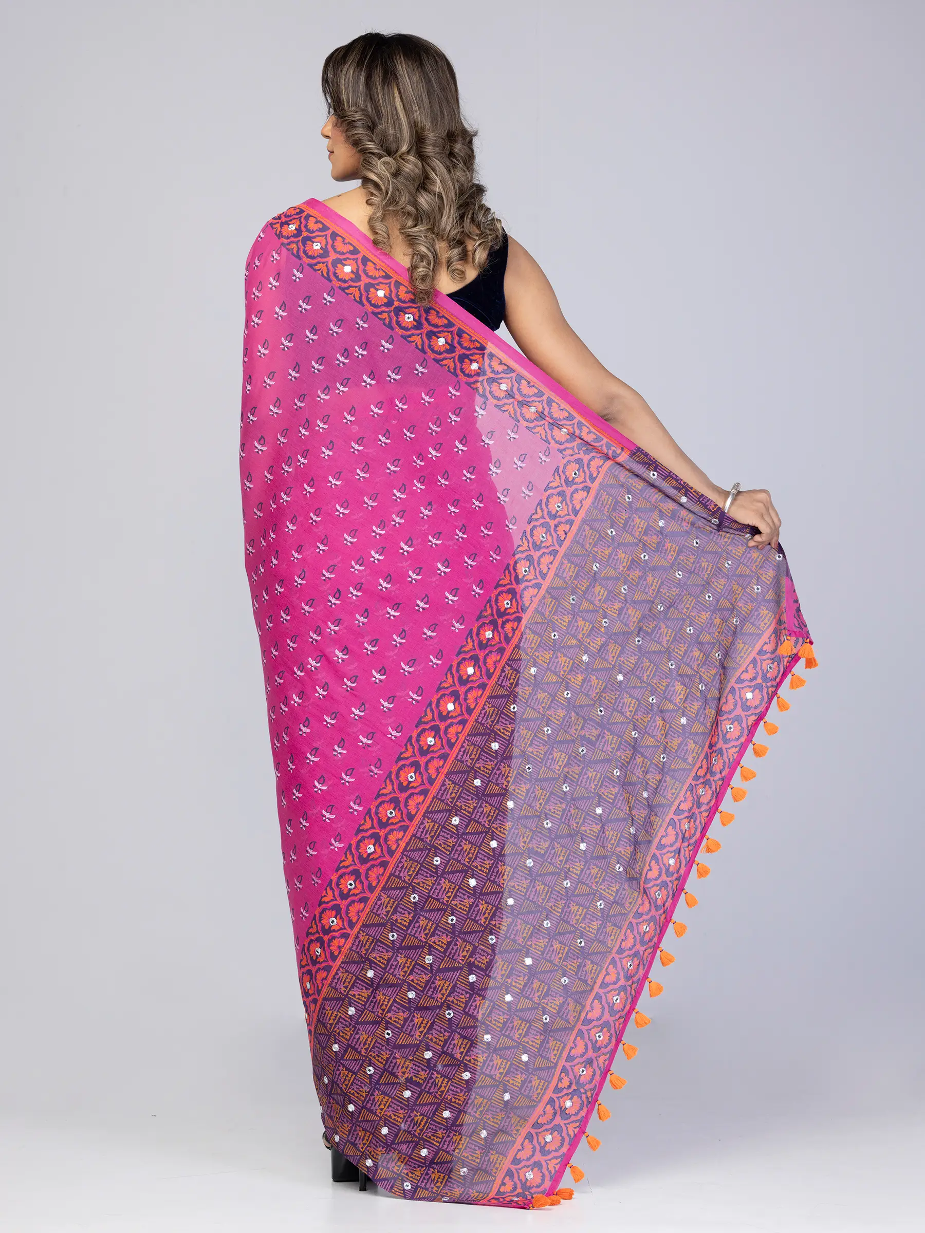 Magenta printed cotton saree with white embroidery. Comes with matching unstitched blouse piece attached at the end of saree. Blouse shown in the photo is a styling suggestion, it is not a part of the actual product.